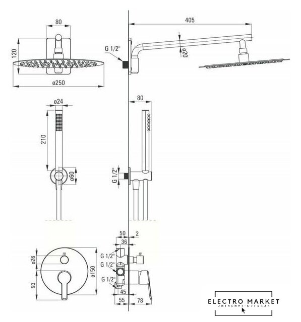 душевая система (185 мм), настенный монтаж, термостатический смеситель