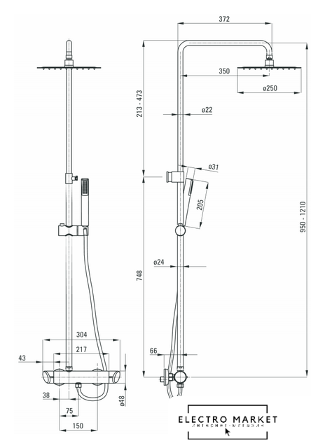 душевая система (с верхним душем), настенный монтаж, термостатический смеситель, верхний душ 250 мм, ручной душ 80 мм