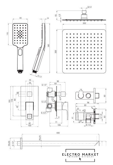 душевая система (250 мм), настенный монтаж, термостатический смеситель