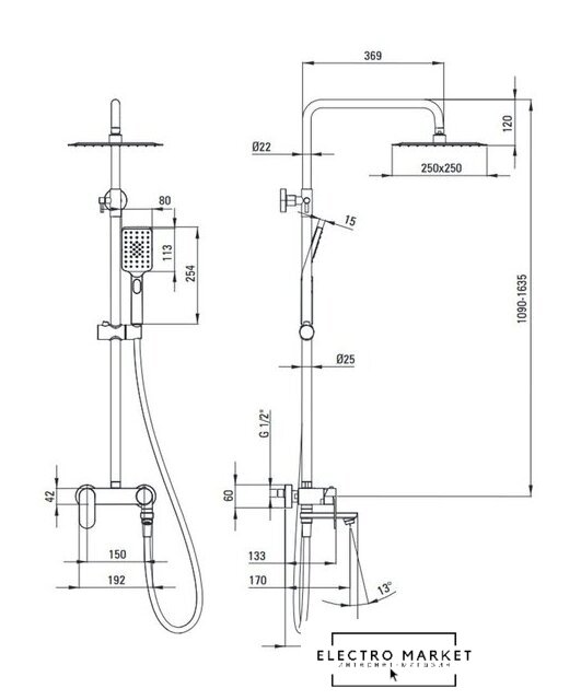 | Комплектация | верхний душ, штанга, ручной душ (лейка), держатель лейки, шланг, смеситель, излив для ванны |