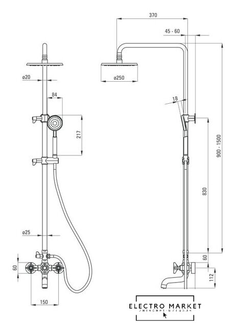 | Диаметр (ширина) верхнего душа | 250 мм |