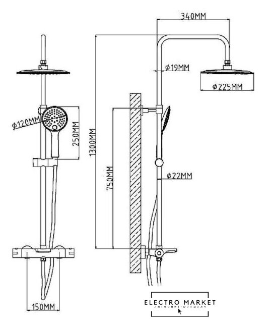 | Диаметр (ширина) верхнего душа | 225 мм |