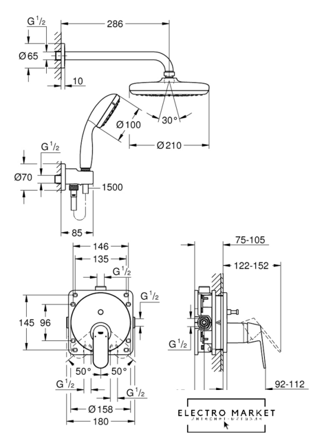 душевая система (с верхним душем), настенный/скрытый монтаж, механический смеситель, верхний душ, ручной душ 32 мм