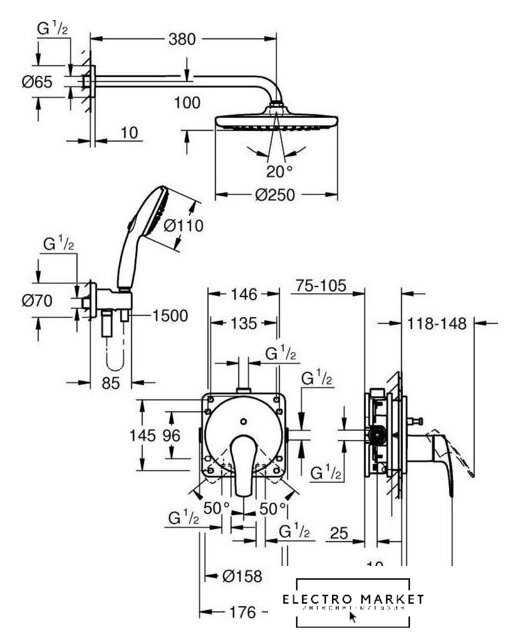 | Диаметр (ширина) верхнего душа | 250 мм |