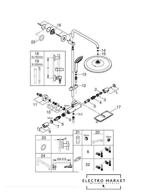 душевая система (с верхним душем), настенный/скрытый монтаж, механический смеситель, верхний душ 250 мм, ручной душ 100 мм