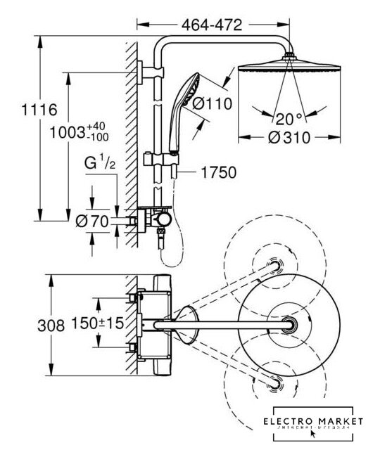 Вылет верхнего душа | 472 мм (464-472 мм) |