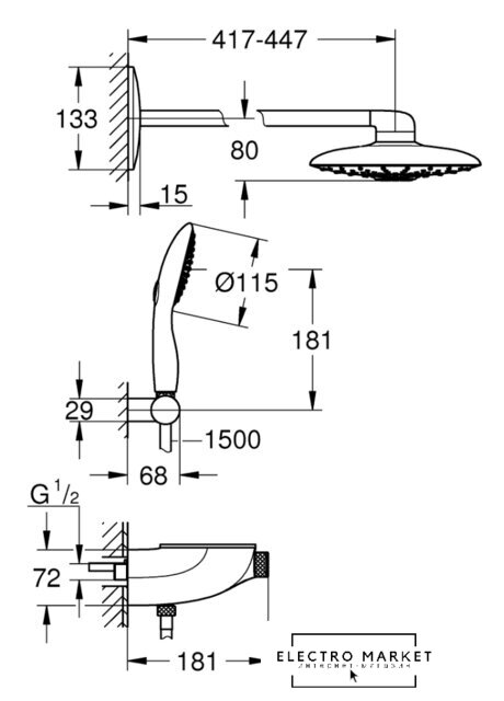 | Диаметр (ширина) верхнего душа | 450 мм |