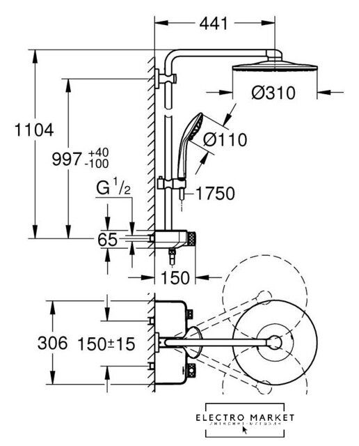 | Вылет верхнего душа | 441 мм |