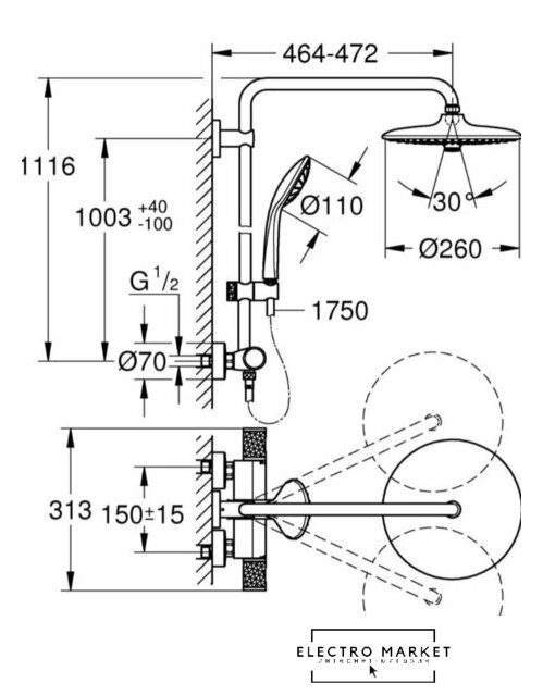 душевая система (с верхним душем), настенный монтаж, термостатический смеситель, верхний душ 250 мм, ручной душ 80 мм