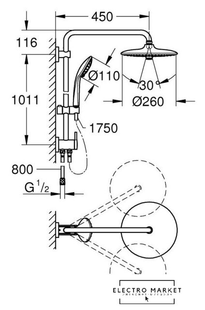 | Диаметр (ширина) верхнего душа | 260 мм |