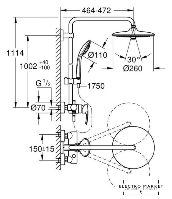 | Вылет верхнего душа | 472 мм |