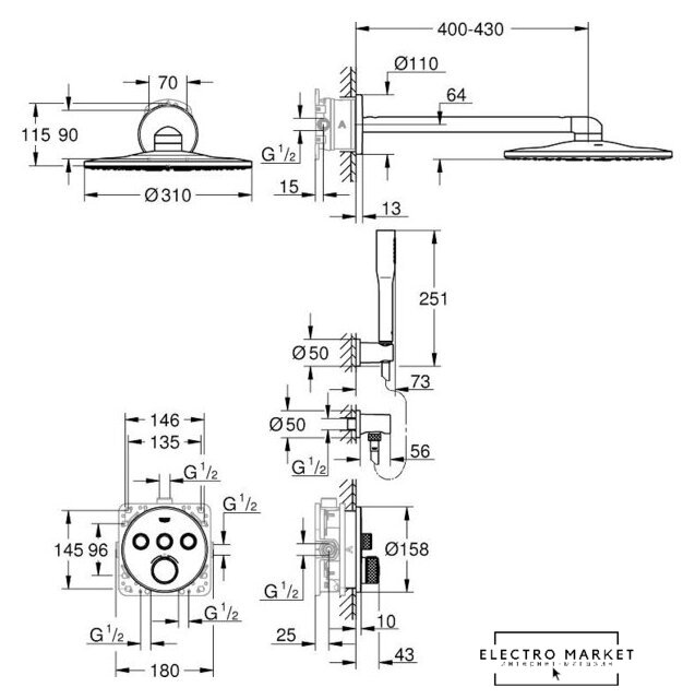 | Диаметр (ширина) верхнего душа | 310 мм |