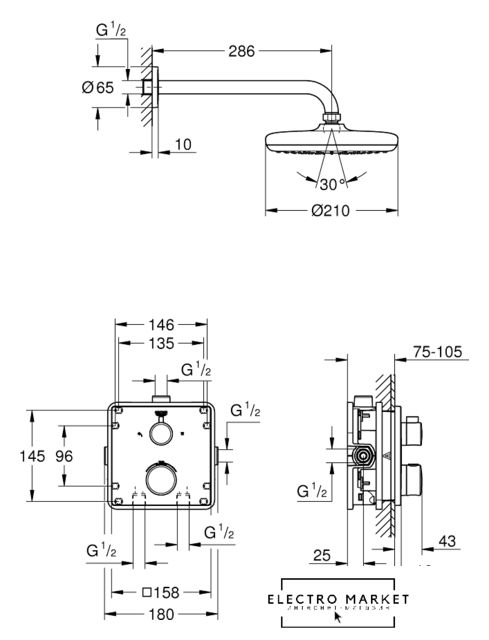 душевая система (240 мм), скрытый монтаж, механический смеситель