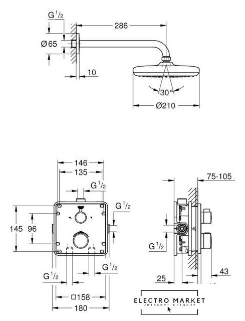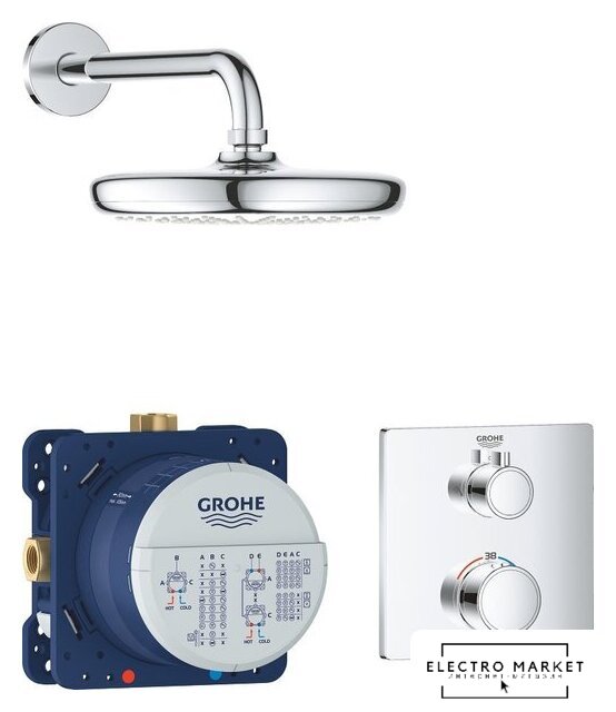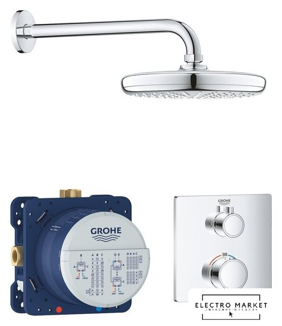 душевая система (с верхним душем), скрытый монтаж, термостатический смеситель, верхний душ 210 мм, ручной душ 100 мм