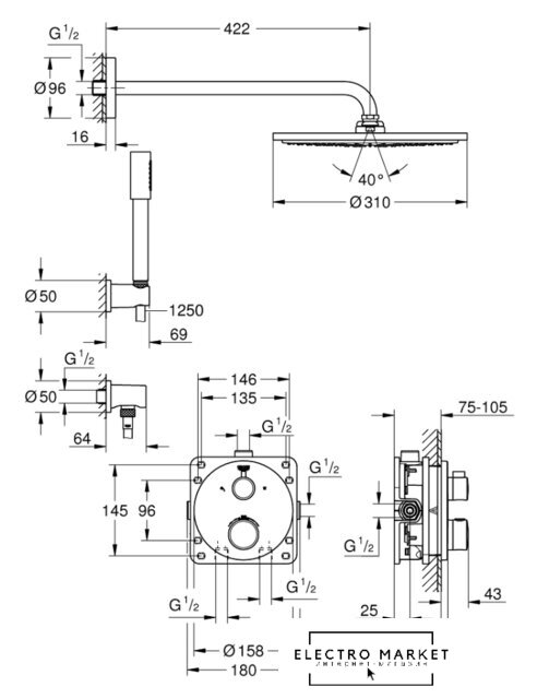 душевая система (310 мм), настенный монтаж, термостатический смеситель