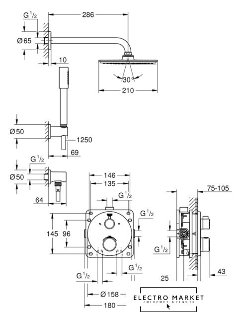 | Диаметр (ширина) верхнего душа | 210 мм |