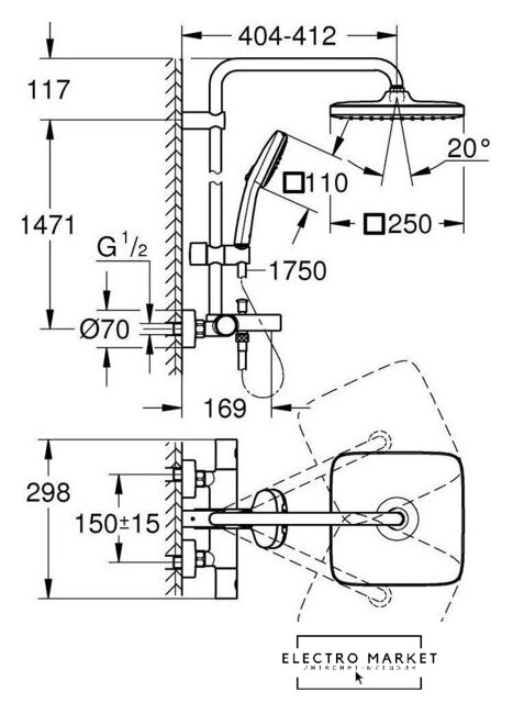 | Диаметр (ширина) верхнего душа | 250 мм |