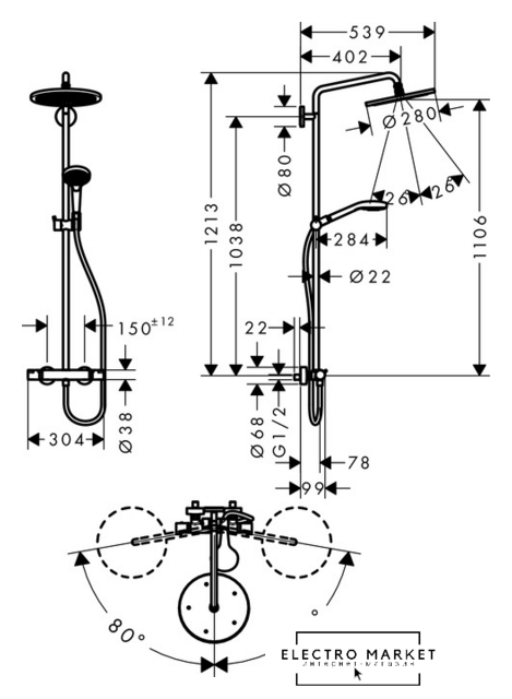 душевая система (260 мм), настенный/скрытый монтаж, термостатический смеситель