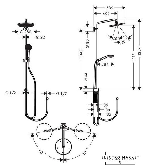 | Диаметр (ширина) верхнего душа | 280 мм |