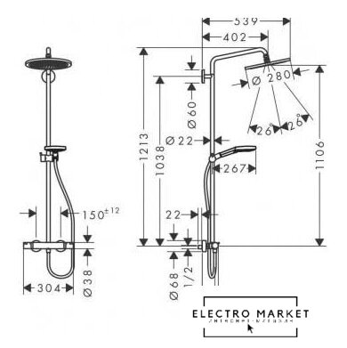 душевая система (361 мм), настенный монтаж, термостатический смеситель