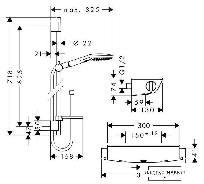 душевой гарнитур (без верхнего душа), настенный монтаж, термостатический смеситель, ручной душ 150 мм