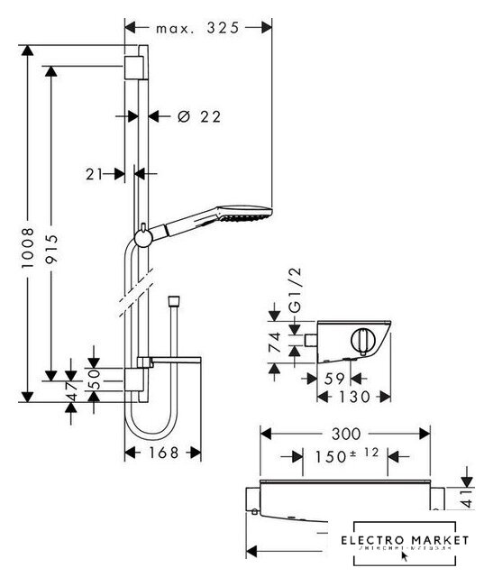 душевой гарнитур (без верхнего душа), настенный монтаж, термостатический смеситель, ручной душ 120 мм