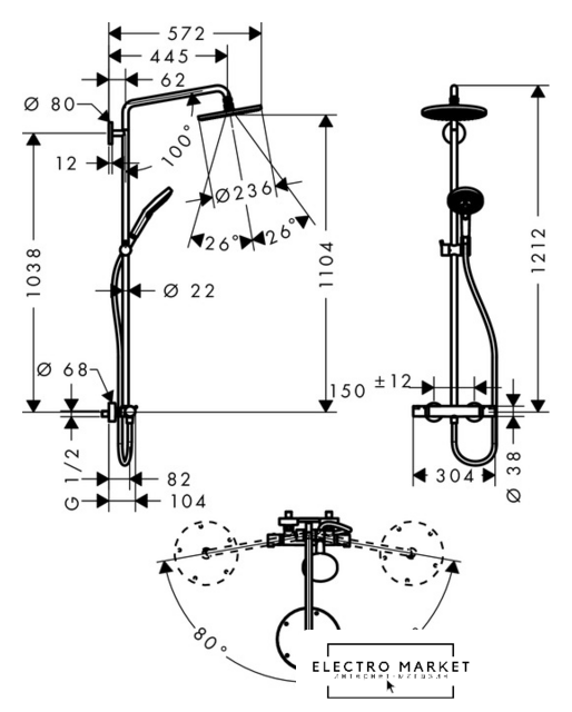 душевая система (310 мм), настенный/скрытый монтаж, термостатический смеситель