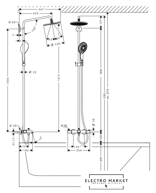 душевая система (363 мм), настенный монтаж, отсутствует смеситель