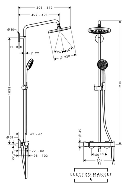 душевая система (210 мм), настенный/скрытый монтаж, термостатический смеситель