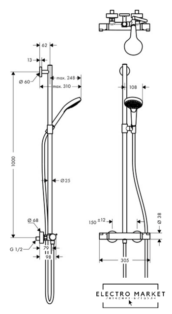 душевой гарнитур (без верхнего душа), настенный монтаж, термостатический смеситель, ручной душ