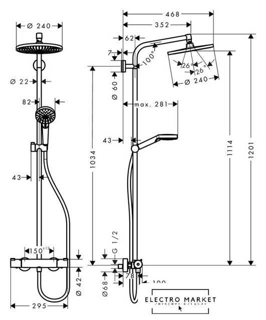 душевая система (с верхним душем), настенный монтаж, термостатический смеситель, верхний душ 250 мм, ручной душ 80 мм