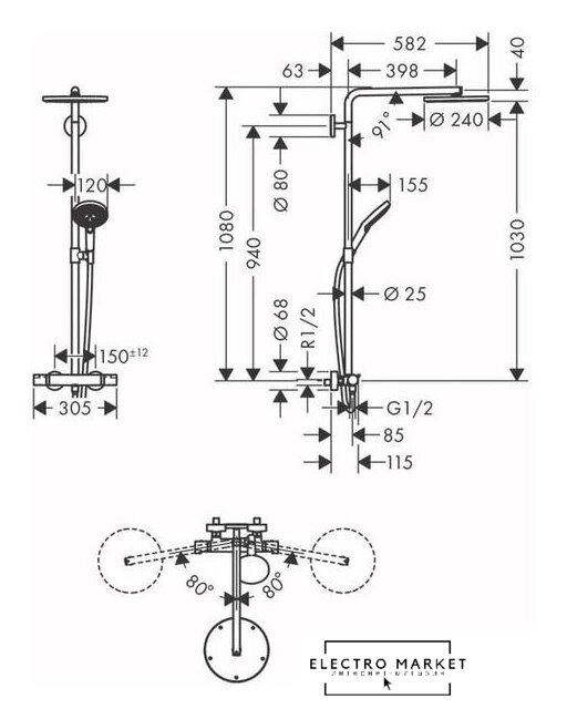 душевая система (361 мм), настенный монтаж, термостатический смеситель