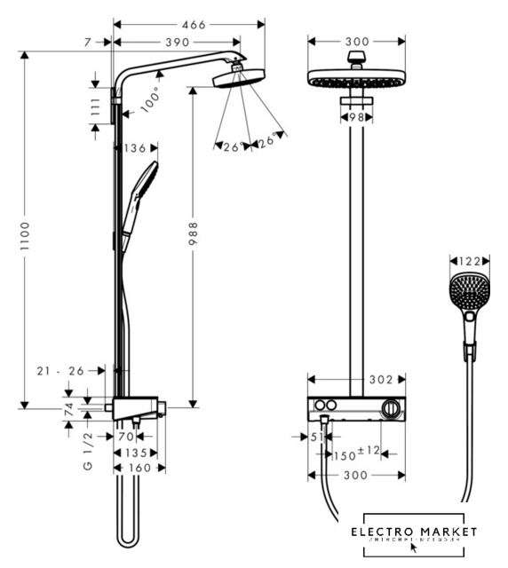душевая система (300 мм), настенный монтаж, термостатический смеситель
