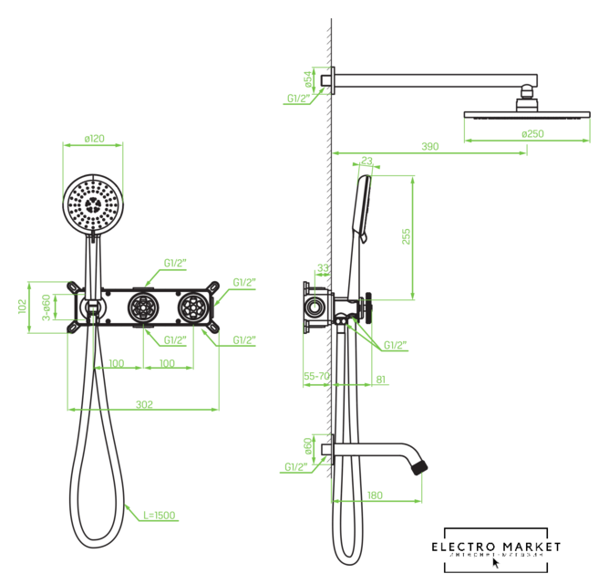 душевая система (с верхним душем), настенный монтаж, термостатический смеситель, верхний душ 250 мм, ручной душ 120 мм