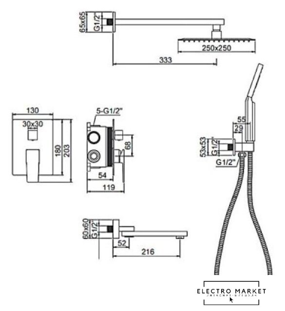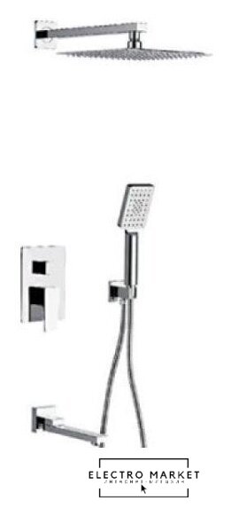 | Комплектация | верхний душ, ручной душ (лейка), держатель лейки, шланг, смеситель, излив для ванны |