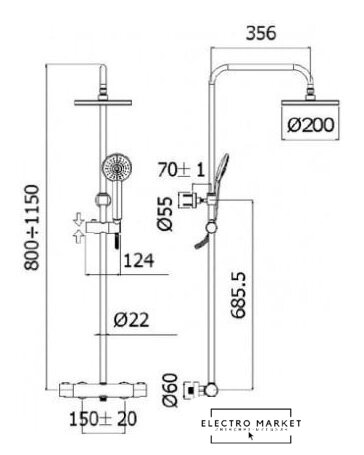 | Диаметр (ширина) верхнего душа | 200 мм |