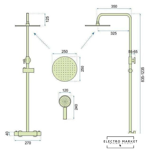 | Диаметр (ширина) верхнего душа | 250 мм |