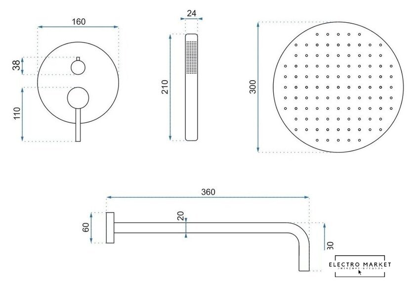 | Диаметр (ширина) верхнего душа | 300 мм |