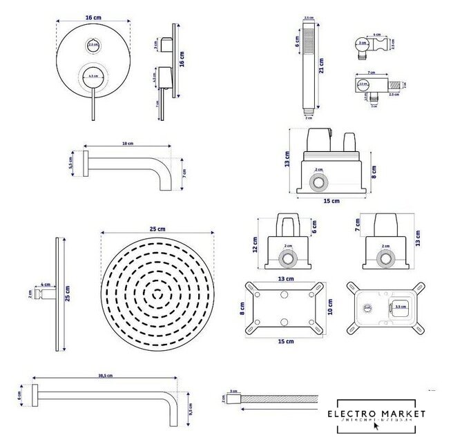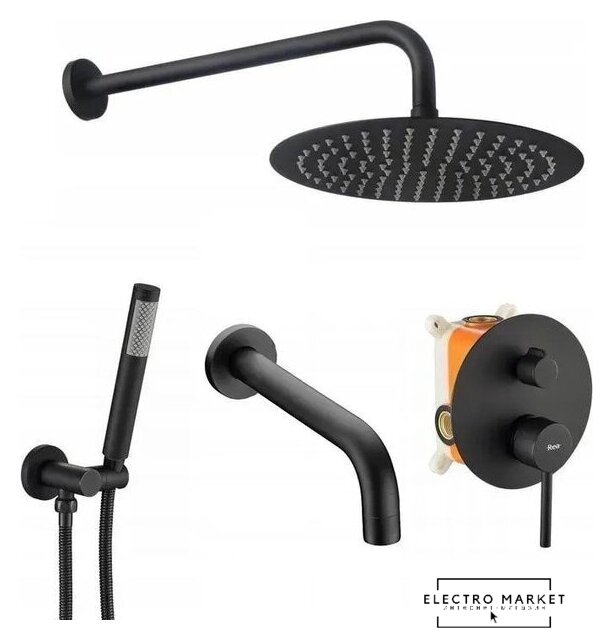 | Комплектация | верхний душ, ручной душ (лейка), держатель лейки, шланг, смеситель, излив для ванны |