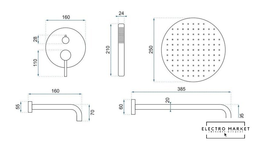 | Диаметр (ширина) верхнего душа | 250 мм |