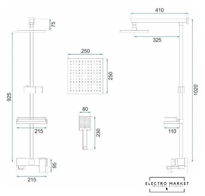 | Диаметр (ширина) верхнего душа | 250 мм |