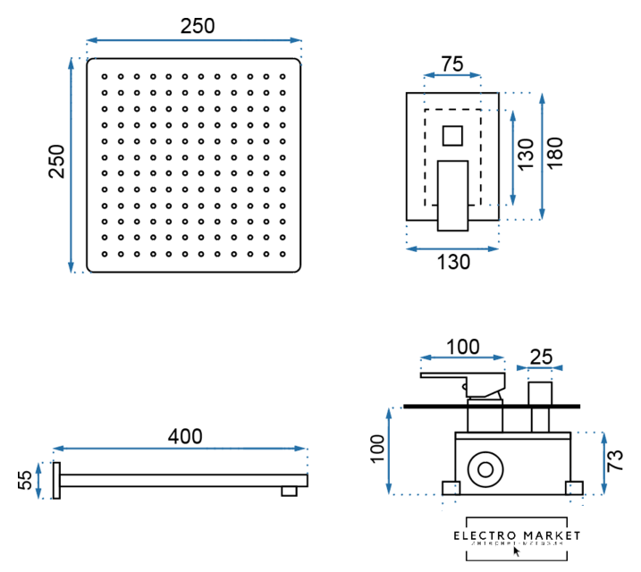 душевая система (250 мм), настенный монтаж, термостатический смеситель