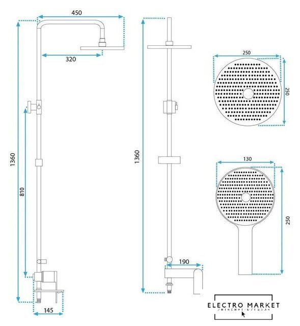 душевая система (с верхним душем), настенный монтаж, механический смеситель, верхний душ 250 мм, ручной душ 80 мм