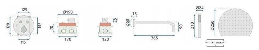 душевая система (с верхним душем), настенный монтаж, термостатический смеситель, верхний душ 250 мм, ручной душ 120 мм
