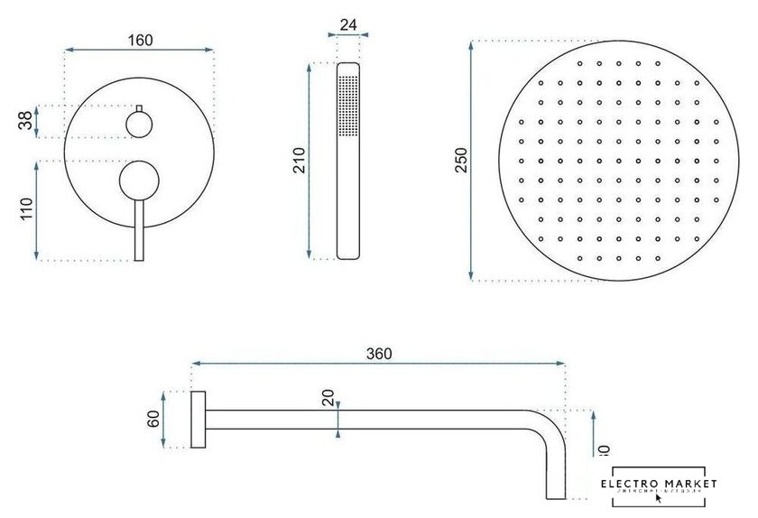 душевая система (с верхним душем), настенный монтаж, термостатический смеситель, верхний душ 250 мм, ручной душ 120 мм