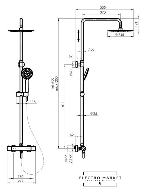 душевая система (с верхним душем), настенный монтаж, термостатический смеситель, верхний душ 250 мм, ручной душ 100 мм