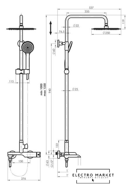 душевая система (250 мм), настенный монтаж, термостатический смеситель