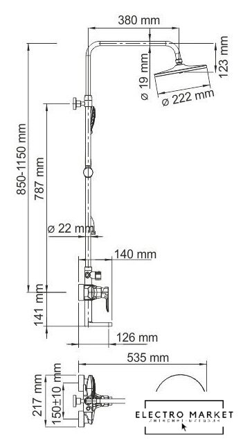 | Диаметр (ширина) верхнего душа | 222 мм |