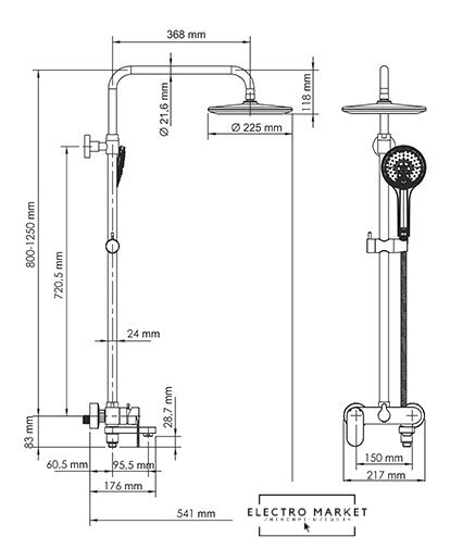 | Диаметр (ширина) верхнего душа | 225 мм |