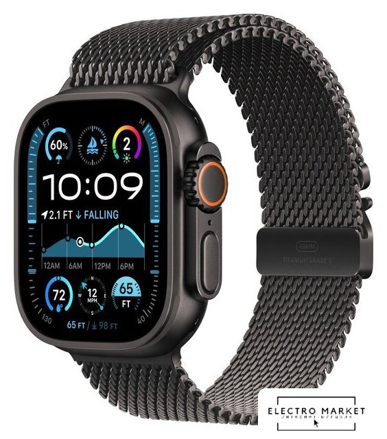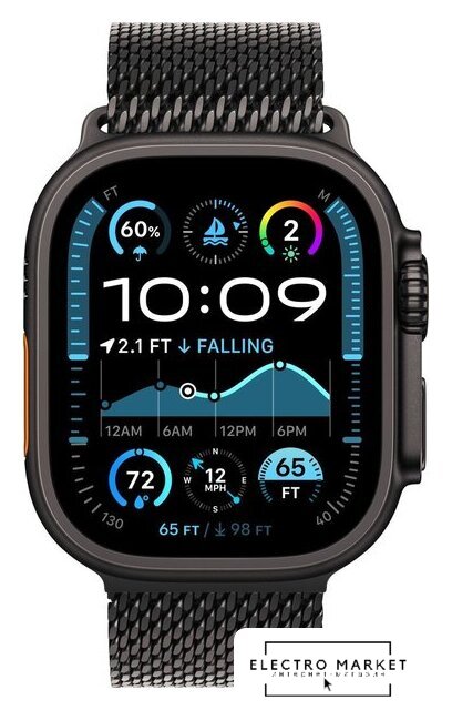 синхронизация с iOS, экран AMOLED, поддержка SIM-карты: e-SIM, пульсометр, измерение кислорода в крови, ЭКГ, AOD, GPS, Bluetooth 5.3, корпус: металл (титан), ремешок: ткань